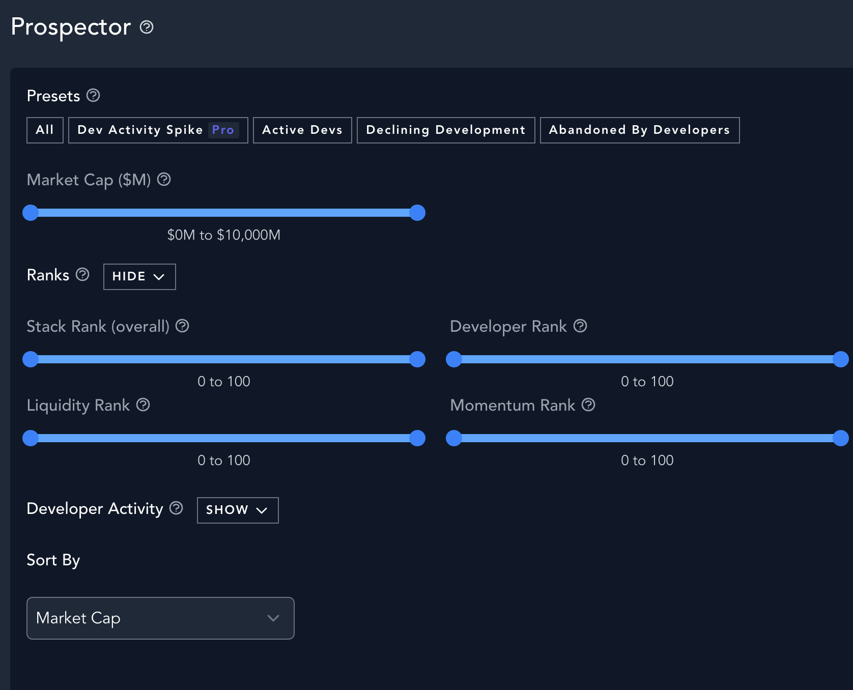 You can currently search by all the ranks, market cap, plus some previously unreleased developer activity metrics. There’s more to come in the following weeks.
