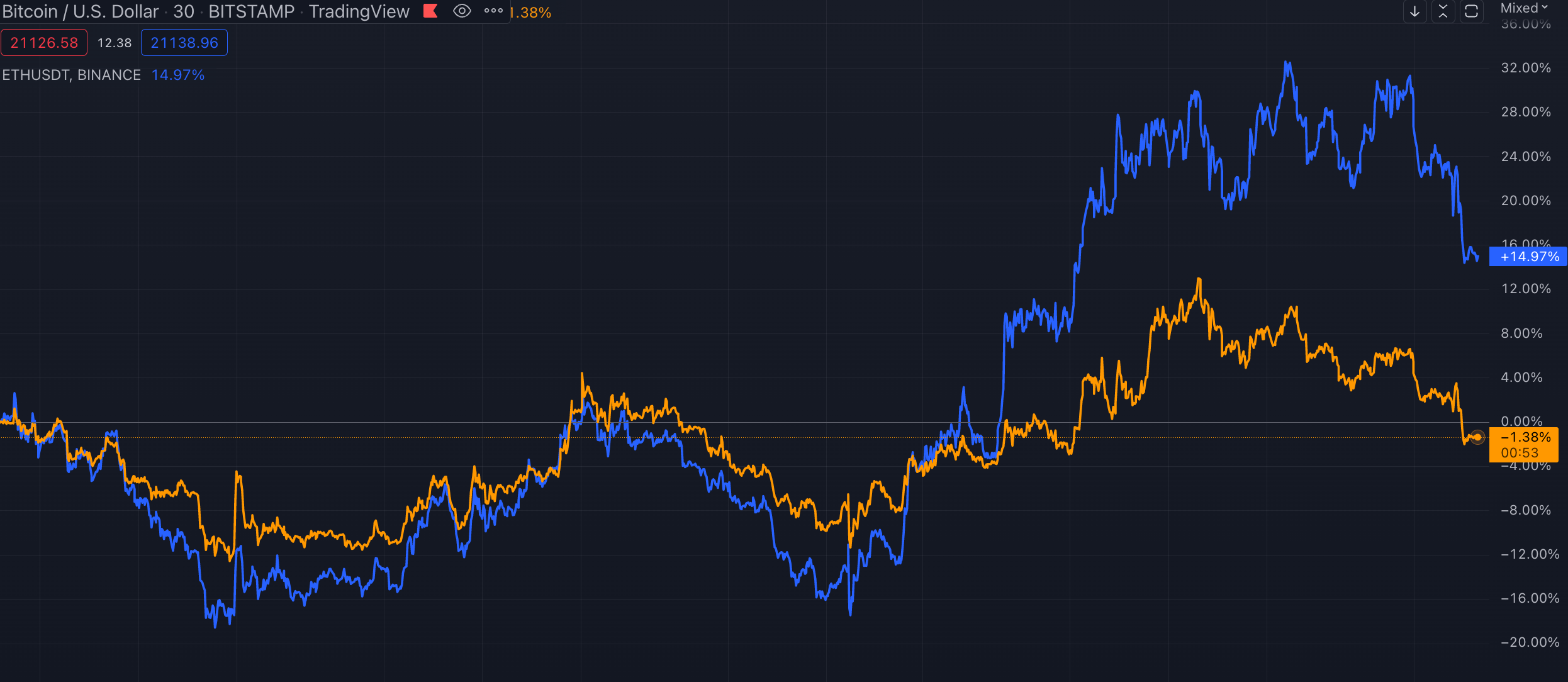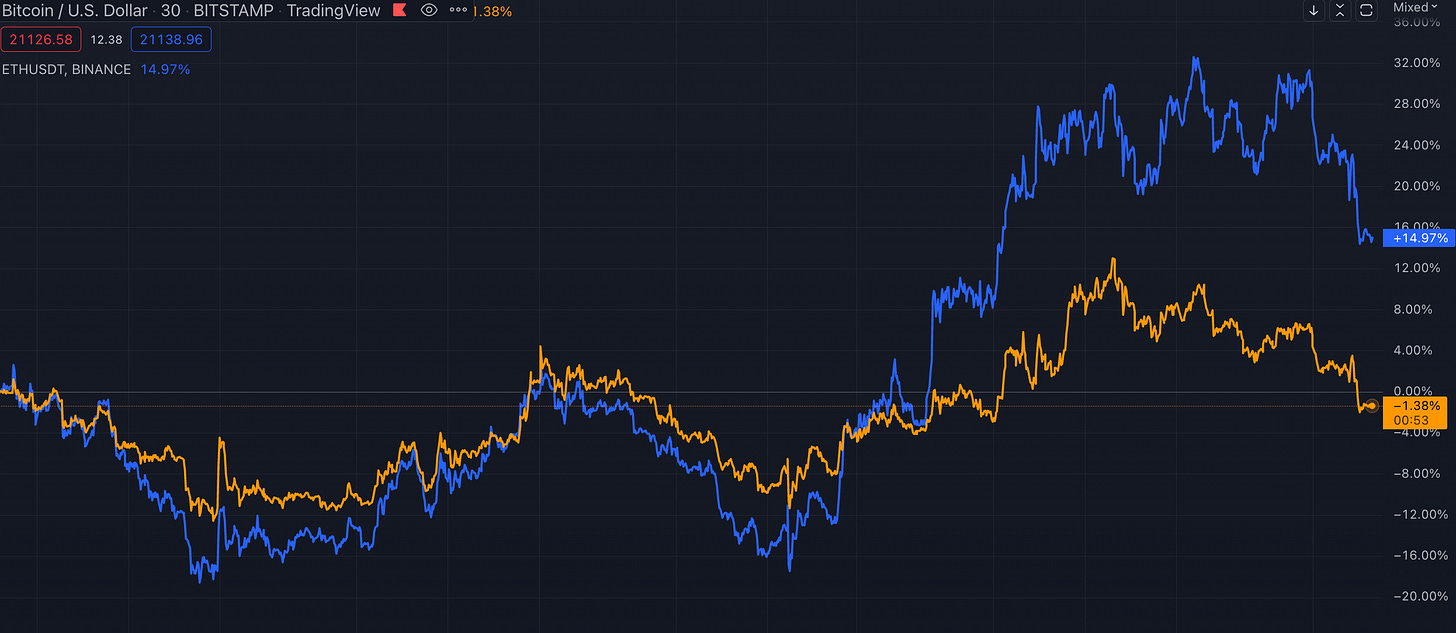 ETH (blue) has continued to outperform BTC (orange) over the past month.