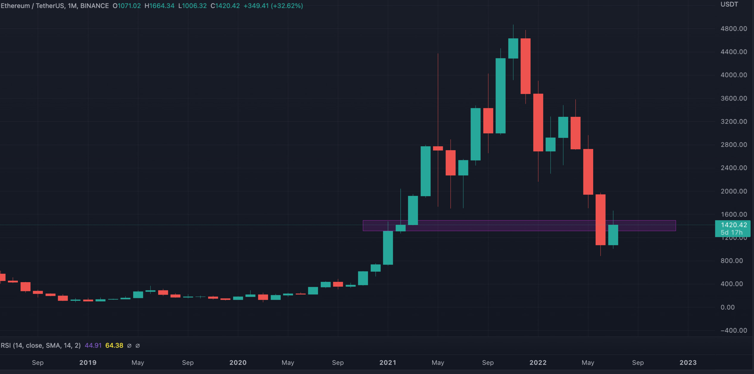 The key test will be whether Ethereum can monthly close above the $1300-1500 zone and claim it as support. As we can see on the ETH monthly chart: