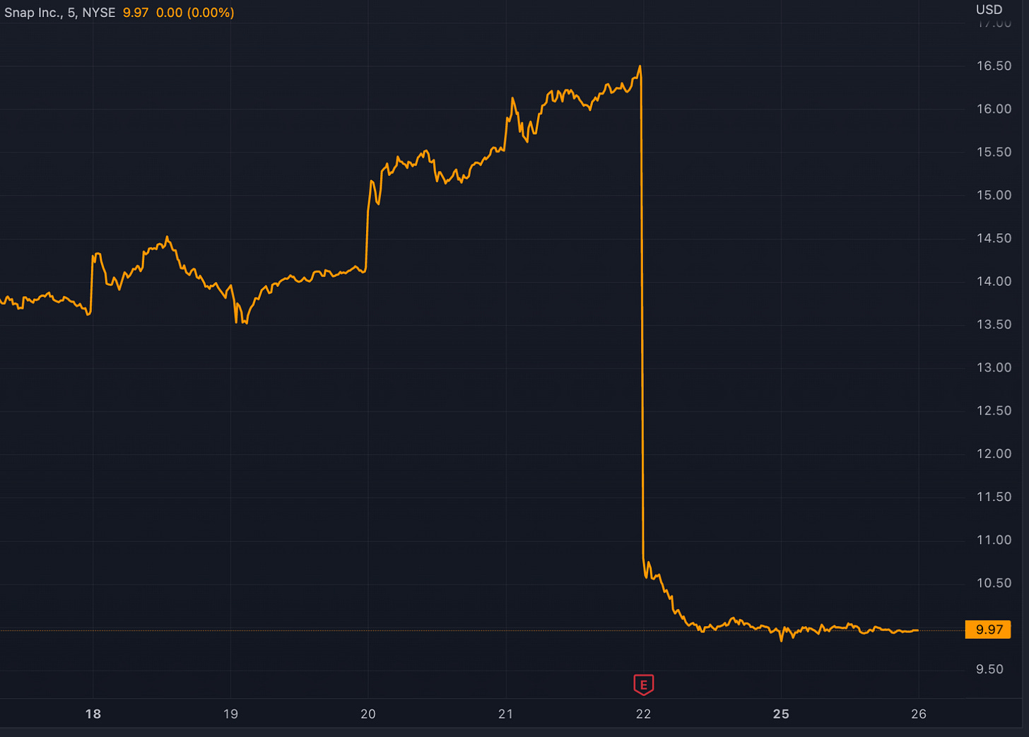Snap Stock also fell off a cliff after another disappointing quarter. The stock is now down almost 90% from its peak last year. Advertising budgets are often first hit during economic slowdowns, so the drop could be a canary in the coal mine, signaling an upcoming recession.